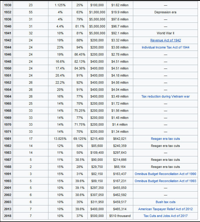 During WWII, during the Presidency of FDR, top tax rates reached 94%. During the Vietnam war, during the Presidency of Kennedy, top rates were reduced from 91% to 77%, and gradually to 70%.[^5] The biggest changes were made during the Reagan Presidency, reducing top rates from 70% to 28%.