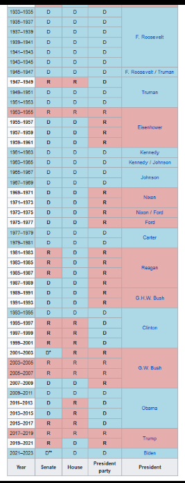 The history of Republican and Democratic control of the Congress and Presidency is shown here:[16]
